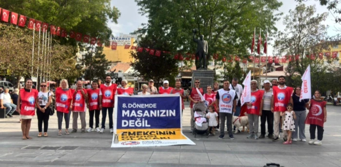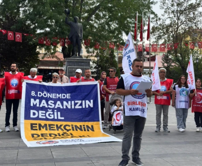 Memurların 2026 ve 2027 yılları için alacağı zam teklifinin açıklanmasının ardından Birleşik Kamu-İş Sendikası üyeleri Karaman'da 81 il ile eş zamanlı bir basın açıklaması yaptı. Birleşik Kamu-İş Sendikası üyeleri “Türkiye’nin her yerinden bize bu sefalet teklifini yapanlara sesleniyoruz: Hodri Meydan! Gelin bakalım bir memur ailesinin evine bir günlük konuk olun.” dedi. Basın açıklamasına “Sadece iki seçenek var: Ya insani ücretler ya meydanlar!” ifadeleri ile başlayan sendika üyeleri açıklamalarında şu ifadelere yer verdiler; “Bugün hem Çalışma Bakanlığı önünde hem de Türkiye’nin tüm illerinde meydanlarındayız. Bugün sesimizi duyurmak, irademizi göstermek, haklarımızın altını çizmek için bir aradayız. Bilindiği üzere; milyonlarca kamu emekçisi, emeklisi ve onların ailelerini ilgilendiren 8.Dönem Toplu Sözleşme sürecinde Bakanlık, taktiksel olarak son ana kadar sakladığı teklifini nihayet salı günü vermiştir. Gülünç bile denemeyecek teklifteki oranlar, teklifin neden son günlere sıkıştırıldığının da anlaşılmasını sağlamıştır. Kamu emekçisinin evine meyve sebzenin taneyle, etin ayda bir girdiği; maaşın yarısına yakınının kira ve faturalar gibi kaçınılmaz giderlerle eridiği şu dönemde hiç utanmadan verilen ücret zammı teklifi şöyledir: “ 2026’nın ilk altı ayı için yüzde 10, ikinci altı ayı için yüzde 6, 2027’nin ilk altı ayı için de ikinci altı ayı için de yüzde 4.” Oysa konfederasyonumuza bağlı AR-GE birimi Kamu Ar’ın araştırmasına göre Temmuz ayında bile açlık sınırı 27 bin 670, yoksulluk sınırı ise 85 bin 344 lirayı bulmuştur. Bu verilen teklifle memura açlık sınırı ile yoksulluk sınırı arasındaki alan reva görülmüş, ölümü gösterip sıtmaya razı etme taktiği devreye sokulmuştur. Kabul etmiyoruz: Sürecin en başından beri bu kez toplu sözleşme masasında Birleşik Kamu-İş olarak bizim de olduğumuzu belirtmiş, müzakere görünümlü müsamerelere geçit vermeyeceğimizi vurgulamıştık. Ne demiştik: Kamu emekçisinin hakkını, alın terini, umudunu, geleceğini sattırmayacağız! Şimdi karşımıza gelen teklif “Biz satarız” demektir. Bu teklif kamu emekçisine de emeklisine de “daha da sürün” demektir. “Biz yıl içinde iyimser tutup sonra 10 defa değiştirdiğimiz enflasyon öngörülerimizin bile altında bir teklifi yapmaktan utanmıyoruz” demektir. Memur çocuğunu okutamasın, evine boynu bükük girsin, en temel ihtiyaçlarını dahi karşılayamasın demektir. Kamuoyu huzurunda açıkça söylüyoruz: Bu sefalet teklifinin gerçek hayatta, gerçek enflasyon karşısında ve vicdanlarda karşılığı yoktur.