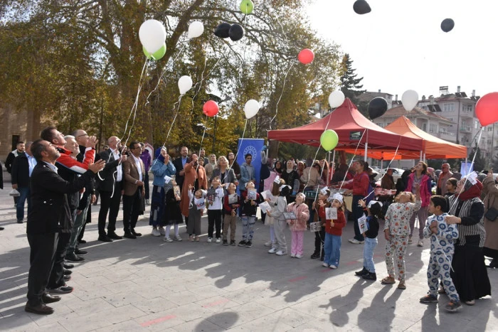 Etkinlik öncesinde, Vali Yardımcısı Çiçekli ve protokol üyeleri, çocuklarla birlikte Filistin bayrağını simgeleyen balonları gökyüzüne bırakarak Gazze halkına olan desteği simgeledi.